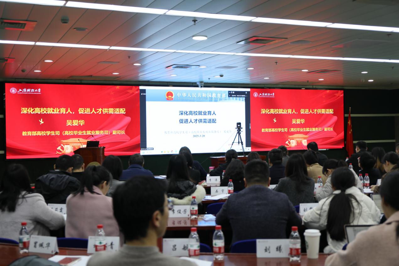 在招生就业宏观政策专题中,教育部高校学生司(高校毕业生就业服务司)副司长吴爱华,为全体学员作了题为 “深化高校就业育人,促进人才供需适配”的报告,报告由学校招生就业处处长彭曦主持。吴司长在报告中指出,党和国家高度重视就业工作,面对复杂的就业形势,出台了多项有力举措,包括大力推进就业市场建设、搭建高效人才对接平台、加快组织春季校园招聘以提升招聘活动实效,以及深化高校 “访企拓岗” 行动、提高岗位利用率等。
