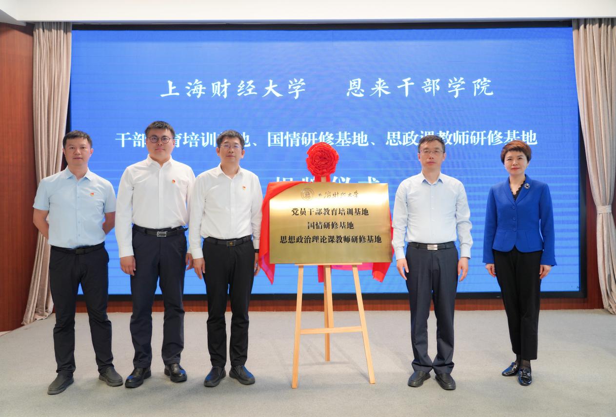 4月19日上午,上海财经大学 “干部教育培训基地、国情研修基地、思想政治理论课教师研修基地”在恩来干部学院正式揭牌。校党委副书记、纪委书记何鹏程与恩来干部学院常务副院长黄少基共同为基地揭牌。何鹏程副书记表示,希望两校以优势互补为纽带,共绘合作发展新篇,学员们以周恩来崇高精神为引领,筑牢理想信念之基,以真抓实干为驱动,推动招就工作行稳致远。