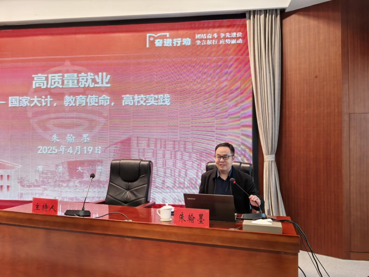 南京大学学生就业指导中心主任朱瀚墨,以 “高质量就业” 为主题,解读相关政策文件,并分享南京大学在就业实践中的宝贵经验,包括实施 “奋进行动”、开展生涯教育、打造就业服务矩阵及探索 “就业+”融合模式等,为我校推进高质量就业工作提供有益借鉴。