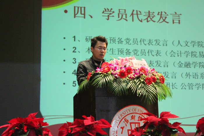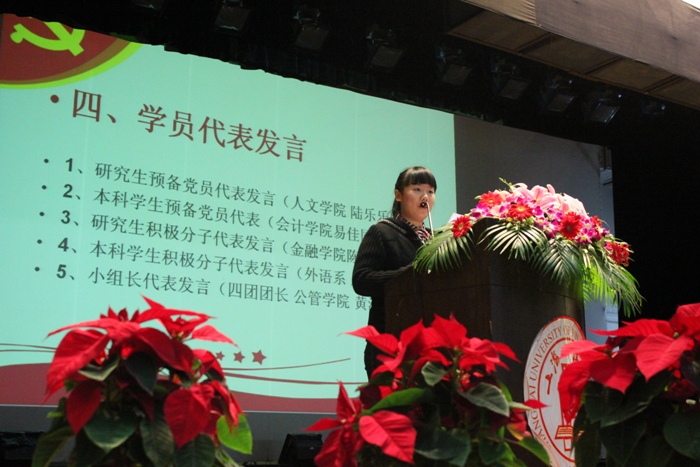 随后的来自5个学院分别代表研究生、本科生预备党员和积极分子的学员代表们依次上台发言,有的激情昂扬,有的稳重深刻,有的活泼幽默、有的饱含深情,但相同的是都代表着同学们对我们伟大的共产党真挚的感情以及完成好本次课程郑重的承诺。