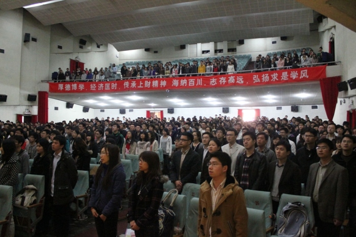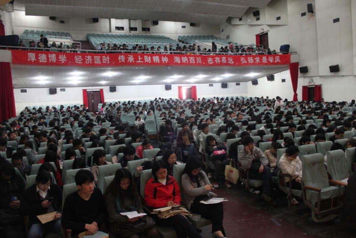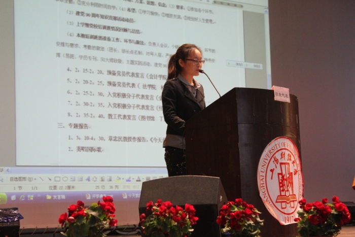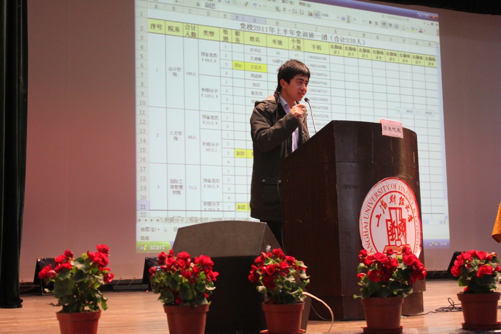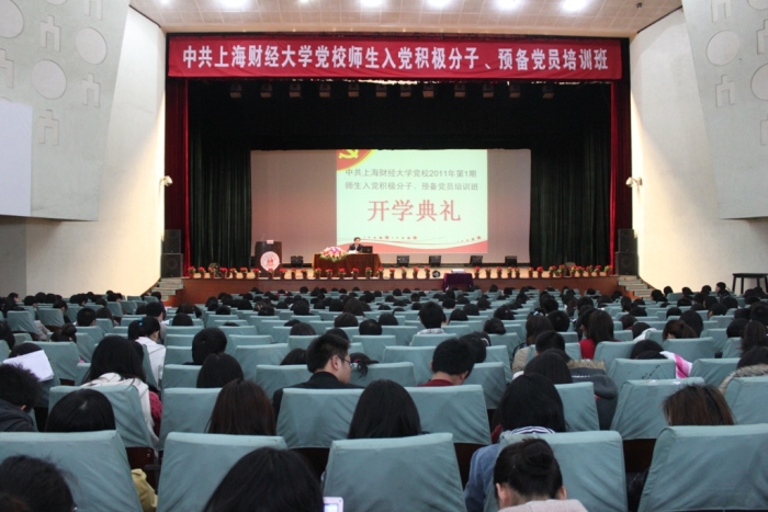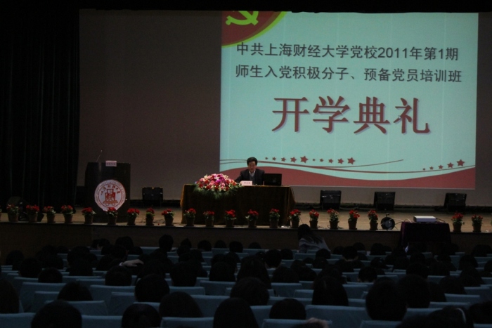 2011年4月12下午1时30分在上海财经大学大礼堂拉开了2011年第1期党校培训班的序幕。在这次的开学典礼上,预备党员和积极分子们都满怀热情,激情澎湃,出勤率接近100%。