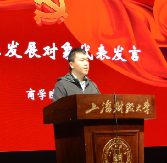 随后,国际文化与交流学院的马欣悦同学代表预备党员发言。她表示,从少先队员到共青团员,再到提交入党申请书成为预备党员,自己正一步步向党组织靠拢。进入新时代,知识更迭速度大大加快,作为党的后备力量,她承诺将以最饱满的热情继续积极学习,学有所悟,学有所行,在实践中不断完善自己。商学院的张皓博同学代表发展对象发言。他表示,新中国成立70周年,祖国的繁荣有目共睹,而这种巨大的成就背后是无数人的坚守,这些默默无闻的前辈带给他努力学习,报效祖国的动力,马克思主义的基本理论带给他科学的世界观和方法论,《钢铁是怎样炼成的》指引他前进的方向。在成长过程中,自己也曾迷茫过,但坚守加入中国共产党的信仰,让他重新认识自我、反思自我。教工代表信息化办公室张旭东老师表示,一代代共产党人攻坚克难的精神激励着他,让他不由自主地靠近他们,以他们为榜样,期待成为他们中的一员。作为一名管理部门的老师,自己的工作在于坚守与热爱,在于服务师生。作为新时代青年人,应当继承先辈们的精神与力量,接过火炬,与祖国共奋进。